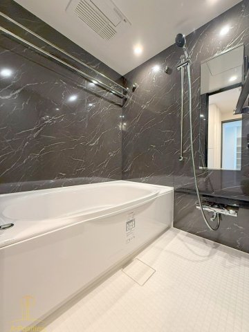ダークトーンの大理石調パネルが印象的なバスルーム。