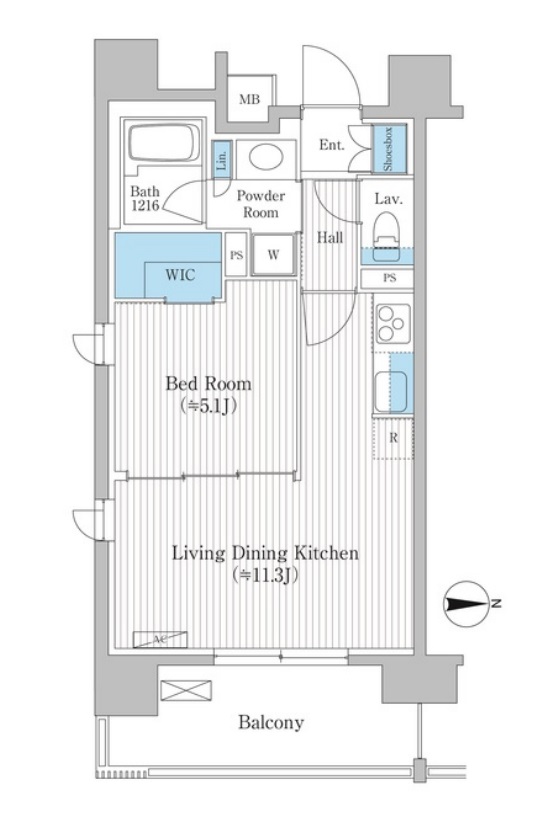 水回りが玄関近くにまとまり、生活動線がスムーズ。WIC付き寝室で収納力が高く、LDKは11.3帖と広々。バルコニーに面した開放感もあり、採光と通風に優れた、暮らしやすい間取りです。