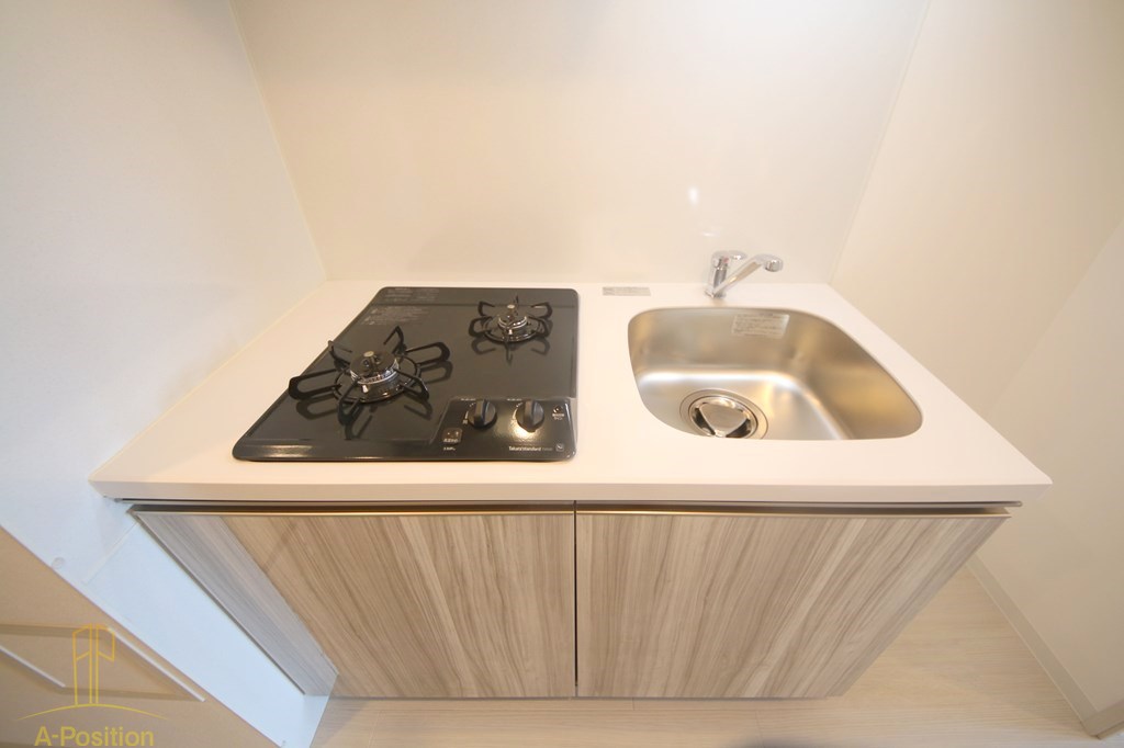 このキッチンは「一人暮らしだからこれで十分」ではなく、「一人暮らしだからこそこだわりたい」をちゃんと形にした空間です。コンパクトながら2口ガスコンロを備えているので、簡単な調理で終わらせる日も、少し手の込んだ料理を作りたい日も無理がありません。